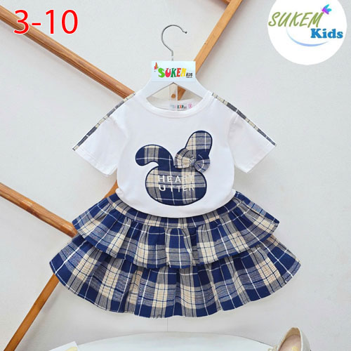 A511535 - Set váy áo chạy dây viền thêu đắp thỏ đính nơ chân váy vải karo may 2 tầng_Size 3-10