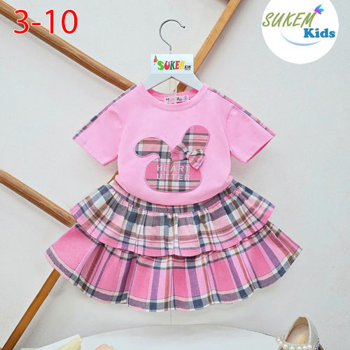 A511538 - Set váy áo chạy dây viền thêu đắp thỏ đính nơ chân váy vải karo may 2 tầng_Size 3-10