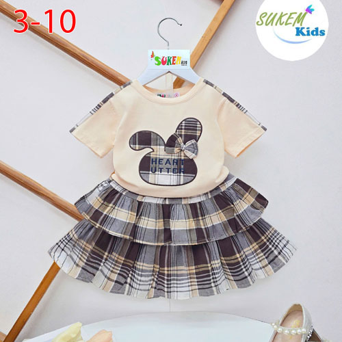 A511539 - Set váy áo chạy dây viền thêu đắp thỏ đính nơ chân váy vải karo may 2 tầng_Size 3-10
