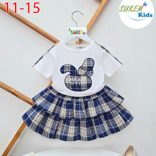 A511544 - Set váy áo chạy dây viền thêu đắp thỏ đính nơ chân váy vải karo may 2 tầng_Size 11-15