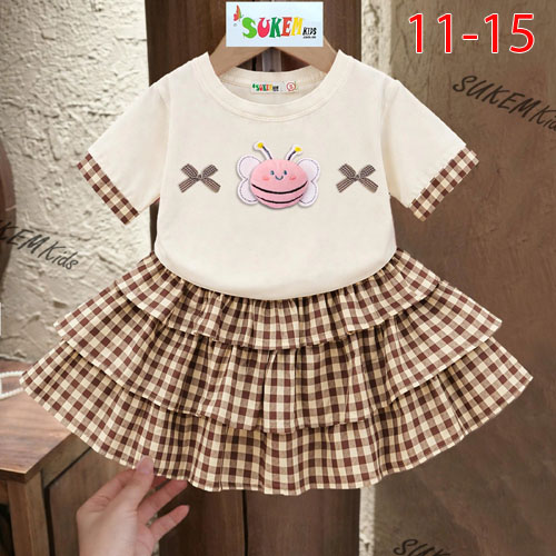 A511681 - Set váy áo thun ngắn tay phối karo đính cham ong nơ chân váy may 3 tầng vải karo_Size 11-1