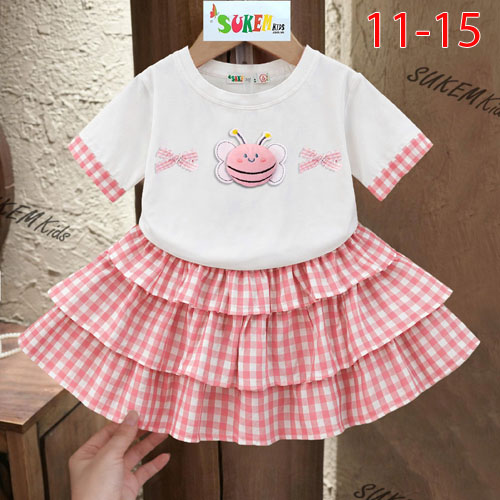 A511682 - Set váy áo thun ngắn tay phối karo đính cham ong nơ chân váy may 3 tầng vải karo_Size 11-1