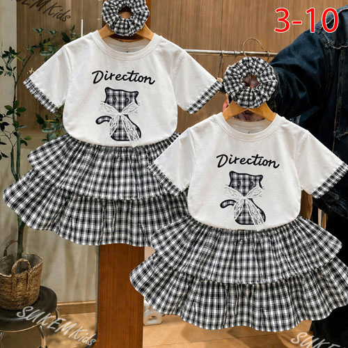 A511980 - Set 3 món cho bé gái áo cắt phối viền thêu đắp mèo đính nơ chân váy vải karo may 2 tầng_Si