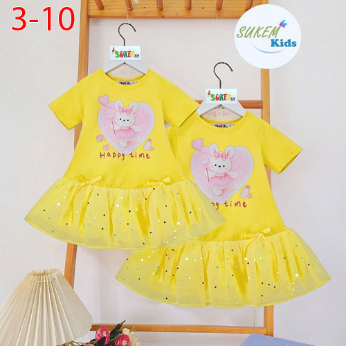 A508596 - Đầm may ngắn tay xinh ép thỏ xinh thân trên vải thun coton 4 chiều đuôi cá đính 2 nơ ruy b